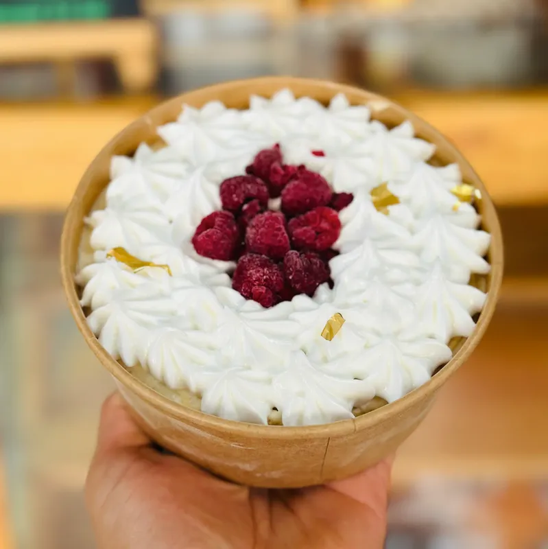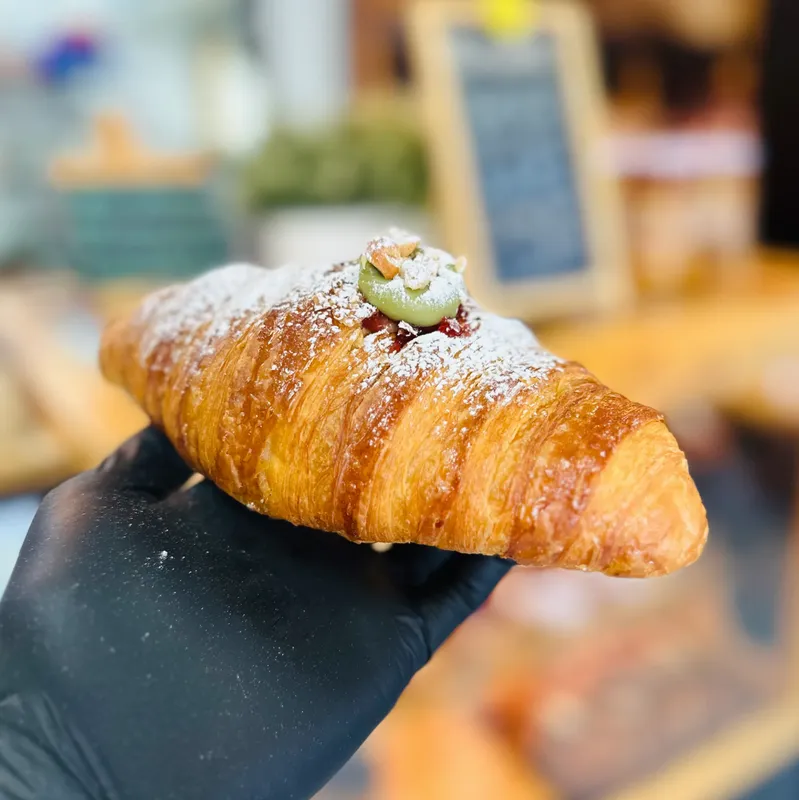 Combinación perfecta nutella , mermelada de frambuesa, ganache de pistacho y frambuesa fresca en un cronut hojaldrado y crujiente.